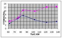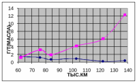 На рис. 2 представлены результаты изменения содержания в масле продуктов износа — металлов, в зависимости от пробега локомотива. Как и следовало ожидать, улучшение тонкости полнопоточной фильтрации со 150 до 30 — 40 мкм уменьшило темпы износа деталей дизеля. Количественная оценка дает почти трехкратное уменьшение темпа износа пар трения благодаря улучшенной фильтрации масла в АСФ.