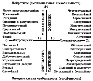 Затем следует по каждому показателю посчитать сумму баллов, начисляя по одному баллу за каждый ответ, совпадающий с ключом. Сравнив полученные результаты по шкалам "Экстраверсия" и "Нейротизм" с интерпретацией в таблицах, необходимо отложить на схеме (см. рисунок) полученные результаты по шкале "интроверсия - экстраверсия" и по шкале "нейротизм" (эмоциональная устойчивость - нестабильность). Сочетание характеристик по двум шкалам укажет на тип темперамента.