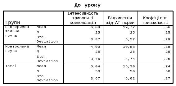 В даній таблиці зображено, що в експериментальній групі спостерігається підвищений рівень тривожності (тропотропний стан). А в контрольній групі спостерігається не підвищений рівень тривожності (енерготропний стан).