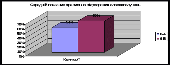Середній показник правильно відтворених словосполучень у 6-Б класі - 69%;