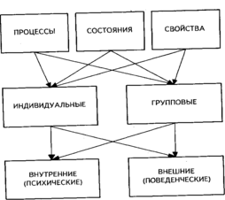 Заметим, что многие из явлений, изучаемых в психологии, нельзя безоговорочно отнести только к одной группе. Они могут быть как индивидуальными, так и групповыми, выступать в виде процессов и состояний. По этой причине в правой части таблицы некоторые из перечисленных феноменов повторяются.