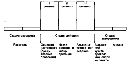 Сеанс психодрамы – это терапевтический сеанс, в котором используются ролевые игры "как будто" и "как есть на самом деле" или их комбинация. Сам сеанс разделен на четыре стадии – разогрев, действие, стадия завершения и шеринг (в этой схеме он не выделен, и является дополнением).
