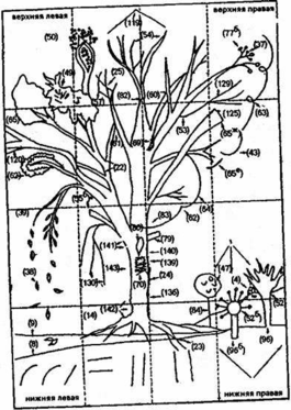 Приводимый, ниже вариант интерпретации, который применялся на нашем факультете, мы считаем полезным дополнением, хотя заранее предупреждаем читателя, что эта версия не прошла достаточную апробацию. Тем не менее, этот материал дает в руки практическому психологу еще один подход, позволяющий уточнить и частично верифицировать те данные, которые могут быть получены в результате применения интерпретаций I и II. Их можно сопоставить с интерпретацией Коха и, как нам представляется, получить более надежные сведения об особенностях личности авторов рисунка.