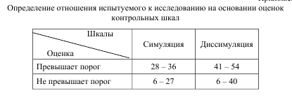 Для получения оценки по каждой из контрольных шкал необходимо суммировать баллы, соответствующие ответам испытуемого на все утверждения шкалы, представленные в таблице «ключей». Склонность к симуляции констатируется при превышении «сырой» шкальной оценкой порогового значения, равного 27. Склонность к диссимуляции – при превышении порогового значения, равного 40.