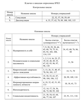 Опросник «Невротические черты личности» (НЧЛ) содержит 119 пунктов – утверждений. Эти утверждения образуют 9 шкал (7 основных – личностных шкал и 2 контрольные шкалы). Основные шкалы опросника характеризуют полярные личностные свойства, играющие определенную роль в развитии неврозов, неврозоподобных и психосоматических расстройств. Контрольные шкалы выявляют отношение испытуемого к процессу исследования и достоверность результатов.