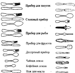 Столовые приборы, применяющиеся на банкетах, могут быть мельхиоровые или из нержавеющей стали. Все столовые приборы делят на основные (индивидуального пользования), с помощью которых едят, и вспомогательные (коллективного пользования), с помощью которых нарезают, раскладывают или перекладывают кушанья из общего блюда (салатника, блюда, вазы и др.) в тарелки гостей. К основным относятся закусочные, рыбные, столовые, десертные и фруктовые приборы (рис. 1).