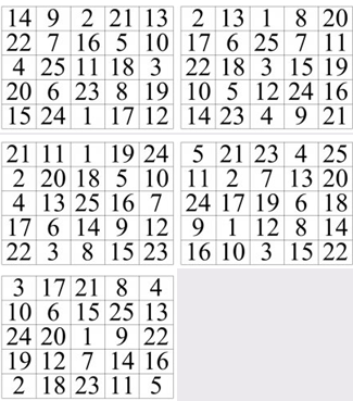 Стимульный материал: 5 таблиц в 25 клеток (5х5), с цифрами расположенными в таблицах в случайном порядке, цифры от 1 до 25.