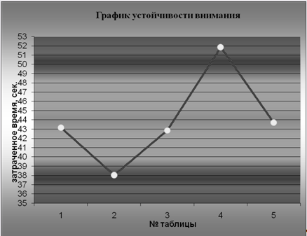 Вывод: анализируя получившийся график можно сделать вывод о том, что внимание у испытуемой неустойчивое, быстро утомляемое, об этом свидетельствует повышенный уровень внимания в начале работы и резкий спад в конце.