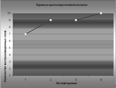 Вывод: анализируя полученные результаты исследования был выявлен средний показатель объема кратковременной памяти у испытуемой.