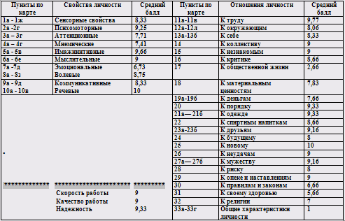 2. Сопоставить степень выраженности наиболее значимых свойств и отношений с успешностью деятельности, оценка которой была дана в конце опросника (скорость работы, качество работы, надежность). Ранжировать изучаемых работников по успешности и сравнить оценки профессионально значимых свойств у работников, имеющих высший и низший ранг.