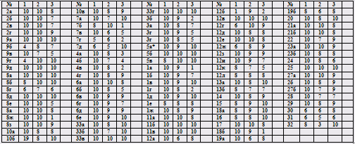 | | 5 | -3 | 0 | -3 | 0 | -1 | + 4... + 7 | -5 | "Странствия" |