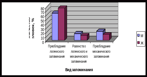 Из диаграммы видно, что как у девушек, так и у юношей логический способ запоминания преобладает над механическим (у 76% девушек и у 64% юношей). Преобладание механического способа запоминания над логическим у 21% юношей и 13% девушек. Равенство логического и механического запоминания у 15% юношей и 11% девушек.
