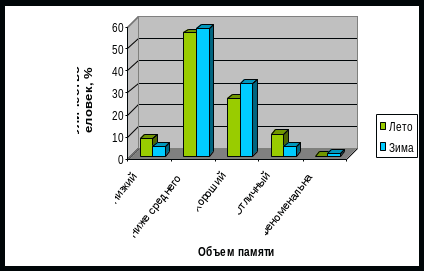 Летом на 4% больше школьников с низким объемом кратковременной памяти, так как у подростков во время каникул нет постоянных тренировок памяти. В учебное время на 7% больше школьников с хорошим объемом кратковременной памяти, чем летом, а летом на 6% больше школьников с отличным объемом кратковременной памяти, так как подростки с хорошо развитой памятью летом отдохнувшие, бодрые.