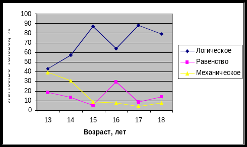Анализируя данные представленные на рисунке 11, можно сделать вывод, что с возрастом ухудшается механическое запоминания и улучшается логическое. В 13-летнем возрасте у 43% школьников логическое запоминание преобладает над механическим, у 18% школьников равенство логического и механического способов запоминания и у 39% школьников механическое запоминание преобладает над логическим. В 14 лет у 57% школьников логическое запоминание преобладает над механическим, у 13% – равенство логического и механического способов запоминания и у 30% – преобладание механического способа запоминания. К 15 годам у 87% школьников логическое запоминание преобладает над механическим, у 5% – равенство логического и механического способов запоминания и всего лишь у 8% школьников преобладание механического запоминания. В 16 лет у 64% школьников преобладает логический способ запоминания, у 29% – равенство логического и механического запоминания и у 7% – преобладание механического запоминания. К 17 годам с преобладанием логического способа запоминания над механическим 88% школьников и всего лишь 8% – с равенством логического и механического способов запоминания и 4% – с преобладанием механического запоминания. В 18-летнем возрасте 79% школьников с преобладанием логического запоминания, 14% – с равенством логического и механического запоминания и 7% – с преобладанием механического запоминания.