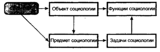 Социология - динамично развивающаяся система научных знаний, в которой развитие осуществляется не только в теоретико-методологическом, концептуально-содержательном, но и в структурно-компонентном смысле. Если выделить последний из названных аспектов, а он для правильного понимания рассматриваемой проблемы является очень важным, то объект, предмет, задачи и функции связаны воедино в общую сеть целостной взаимозависимостью, но главное направление движения научной мысли в этой цепи - это ее перемещение от объекта изучения к предмету, от него - к определению задач и функций социологии.