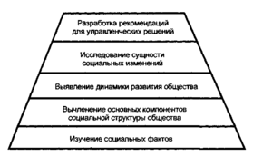 Таким образом, все пять названных задач можно представить в форме усеченной пирамиды, изображенной на рис. 1, исходный пункт которой составляет изучение социальных фактов, а завершение - разработка рекомендаций для принятия управленческих решений.