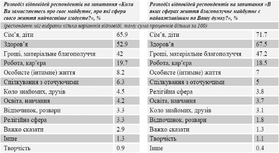 Населення України, думаючи про майбутнє, зосереджується на тих сферах життя, благополуччя в яких, на їхню думку, найважливіше. Найважливішими для населення є сім’я, діти, здоров’я , гроші та матеріальний добробут, а також робота та кар’єра.