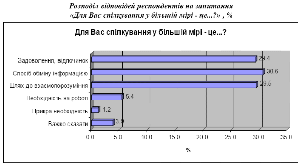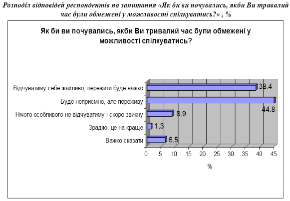 • На думку населення України, спілкування - це і є життя, або принаймні невід'ємна, важлива його частина. У разі втрати можливості спілкуватись більшість населення відчула би себе жахливо, або принаймні некомфортно.