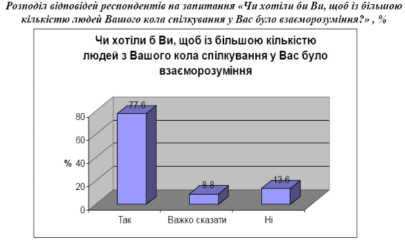 • Практично все населення України відзначає важливість взаємопорозуміння між людьми і вважає це важливою складовою спілкування та життя в цілому. Відповідно прагне щоб взаєморозуміння в їх житті було більше.