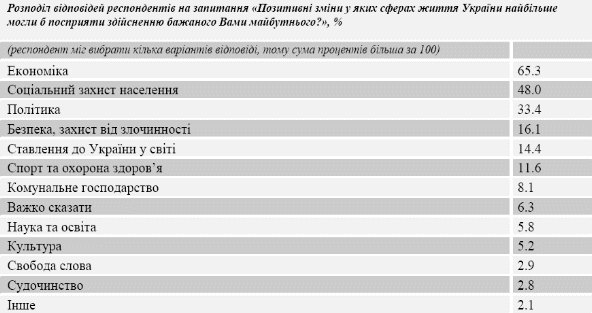 • 45.6% населення України знають, що потрібно робити для досягнення бажаного ними майбутнього. Але досить багато мешканців України (34.6%) сказали, що думали про це, але так і не зрозуміли, що потрібно робити для досягнення мети.