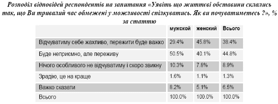 • Цікаво, що жінки частіше, ніж чоловіки характеризують свій стан у разі неможливості спілкуватись тривалий час як цілком критичний.