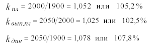 Пример 2. 1. Фактически в 2005 году было произведено 2050 холодильников, а запланировано было произвести 2000. В 2004 году было произведено 1900 холодильников. Тогда, получим: