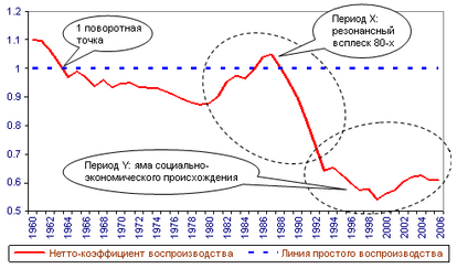 Период Х— характерный резонансный всплеск, вызванный политикой и конъюнктурой 80-х: медленный, рывками подъем, небольшое верхнее плато и ускоряющийся обвал гораздо ниже точки начального роста. Обращает насебя внимание тот факт, что обрушение показателя воспроизводства населения началось задолго доприхода квласти "преступного либерального правительства" и резкого ухудшения социально-экономического положения советского народа.