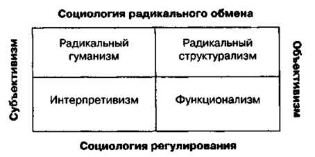 Барелл и Морган предложили следующую теоретическую схему социологических подходов, нашедших отражение в теориях социальной работы.