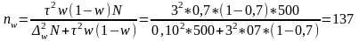 Объем выборки для расчета ошибки доли при N = 500, w = 0,7,