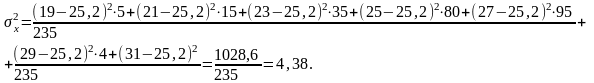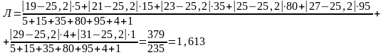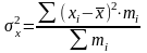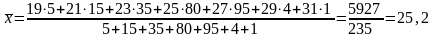 - среднее значение признака; xi - значение признака на интервале (середина интервала); mi - частота повторения признака на интервале.