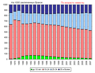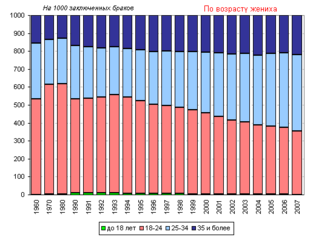 Доля заключенных браков, в которых жених был моложе 25 лет, снизилась с 556 на 1000 браков в 1993 году до 356 в 2007 году, а доля браков, в которых невеста была моложе 25 лет - с 665 до 524, соответственно. Доля "поздних" браков, заключенных в возрасте 35 лет и старше, несколько увеличилась только у мужчин (до 210-220), а у женщин оставалась сравнительно стабильной (150-160).