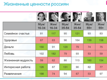 По статистическим данным, изображенным на таблице, можно сделать вывод, что у мужчин стремление к семейному счастью появляется только к 55 годам. На первых местах до этих лет стоят деньги и интересная работа. У женщин же совсем наоборот: любовь и семейное счастье они начинают ценить с 16 лет. К старости у обоих полов возрастает интерес к своему здоровью и к жизненной мудрости.