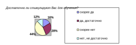 Отсюда следует, что большинство студентов (44% "скорее нет" и 12% "нет, не достаточно") считают, что их недостаточно стимулируют. А 28% студентов довольны, и отметили, что "да, достаточно".