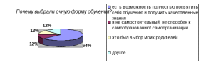 Таким образом, большинство студентов (64%) выбрали очную форму обучения сознательно и хотят получить качественные знания. Студенты, которые выбрали вариант "другое", отметили: