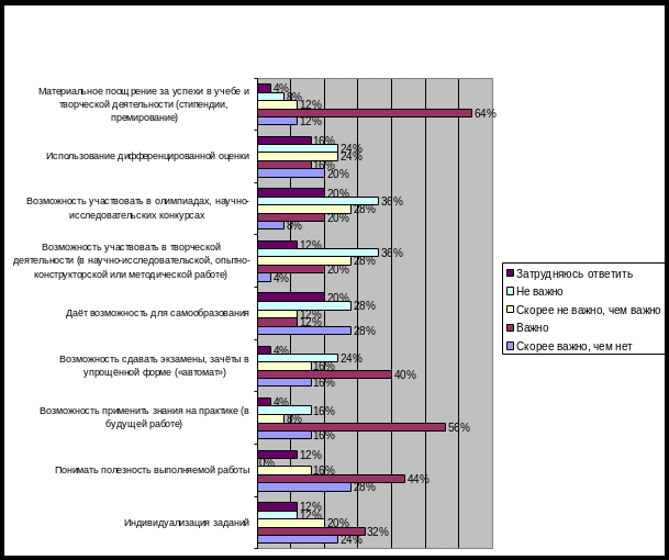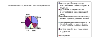 Отсюда следует, что большинство студентов (56%) предпочитает получить "зачёт/незачёт", чем реальную оценку знаний. Всего 16% рассматривают дифференцированную оценку как "возможность оценить уровень знаний", а для 12% оценка является стимулом. И 16% безразлично по какой системе их оценивают.