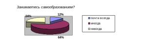 Очевидно, что очень мало студентов (только 12%) находят желание и время "почти всегда" заниматься самообразованием. Однако, большинство студентов (64%) отметили "иногда", что показывает положительную динамику, возможность перейти в группу "почти всегда" при желании и волевых усилиях. Достаточно большой процент студентов (24%) не занимаются самообразованием.