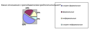 Отсюда следует, что большинство студентов (76%) рассматривают преподавателя, в первую очередь, как источник знаний и предпочитают "скорее формальные" (52%) или "формальные" (24%) отношения.
