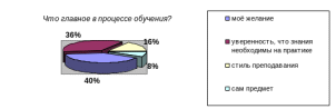 На вопрос, "что для студентов главное в процессе обучения", были получены следующие ответы: большинство студентов - 40% - отметили, что "их желание"; 36% студентов отметили, что "уверенность, что знания необходимы на практике"; 16% студентов ответили, что для них главное "стиль преподавания"; 8% ответили, что "сам предмет (материал)";