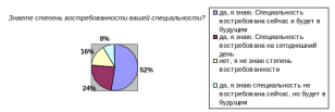 На вопрос, "знают ли степень востребованности их специальности на рынке труда на сегодняшний день", студенты ответили следующим образом: 52% студентов ответили: "Да, я знаю, что моя специальность востребована сейчас и будет востребована в будущем"; 24% ответили: "Да, я знаю, что моя специальность востребована на сегодняшний день"; 16% студентов: "Нет, я не знаю степень востребованности"; 8% ответили: "Да, я знаю, что моя специальность сейчас не востребована, но будет востребована в будущем"; Вариант ответа "Да, я знаю, что моя специальность не востребована, но мне всё равно" не выбрал ни один из опрошенных студентов.