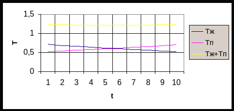 Исходя из динамики трудозатрат, различают 2 возможных варианта развития технологического процесса – ограниченное и неограниченное . Построим график изменения живого и прошлого труда для определения варианта развития техпроцесса. Наши исходные данные : Тж=500/(27t+675) и Тп=0,02t +0.5: