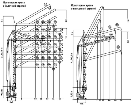 Передвижной (на рельсовом ходу) полноповоротный (с поворотной башней) башенный кран оснащен унифицированными механизмами, монтируется и демонтируется при помощи собственных механизмов и автокрана грузоподъемностью 8 тонн, перевозится в собранном виде на подкатных тележках. В зависимости от исполнения башенный кран может быть укомплектован балочной стрелой с грузовой тележкой или подъемной стрелой. Балочная стрела может находиться в горизонтальном или в наклонном (под углом 30 градусов) положении. Предназначен для работы в I-VI ветровых районах по ГОСТ 1451-77 и в климатическом исполнении "У" категории I по ГОСТ 15150-69 при температуре окружающего воздуха от -40 до +40°С. Сейсмичность до 6 баллов включительно. Группа режима работы крана А4 по ИСО 4301/1-86. Задний габарит - 4,2 м.