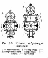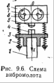 Двухвальний електричний вібромолот, схема котрого показана на рис.1.2.3, складається з ударної частини 8, підвішеної на наголівнику 3 за допомогою пружин 2, розміщених симетрично осі ОХ. В ударній частині вбудовані два однаково розміщених електродвигуна, ротори 7 котрих синхронно обераються в протилежні сторони навколо паралельних осей. На кінцях валів роторів насаджені делебанси 6. Оскільки проекції центрів мас обох обертових частин на ось ОХ постійно співпадають, обертання делебансів збуджує коливання ударної частини вздовж осі ОХ. Ці коливання чергуються з ударами ударника 5 в на ковальню 4 наголовника, котрий жорстко закріплений на сваї.