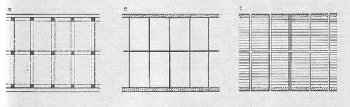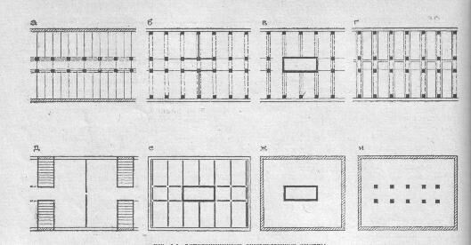 Наряду с основными конструктивными системами широко применяют и комбинированные, в которых вертикальные несущие конструкции компонуются из разнотипных элементов. Наиболее распространенные из них см. рис. 30.