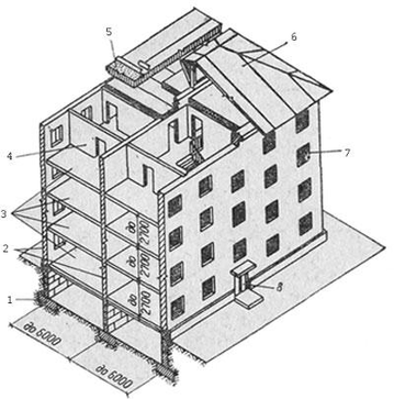 Рис. 1. Основные элементы кирпичного жилого дома:1 - фундаменты; 2 - стены; 3 - перекрытия; 4 - перегородки; 5 - бесчердачная крыша (один из вариантов); 6 - чердачная крыша; 7 - окно; 8 – дверь.