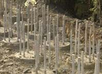 Иногда используют такую конструкцию свайного фундамента, когда сваи изготавливаются непосредственно в грунте. Для этого бурят скважину, вставляют в неё арматурный каркас и полые трубы. Далее всё это заливают бетоном. После чего бетон необходимо уплотнить утрамбовкой или вибрацией.