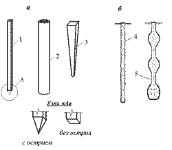 б – сваи, изготовляемые непосредственно на строительной площадке: 4 – буровая без уширений, 5 – буровая (или набивная) с уширениями