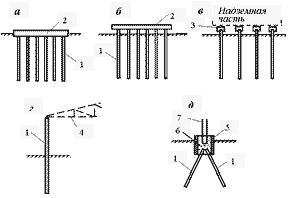 а – с низким ростверком, б – с высоким ростверком, в – безростверковый, г – свая-колонна, д – комбинированный свайный фундамент;