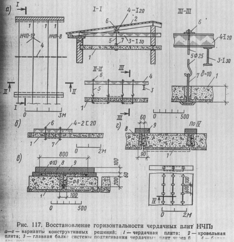 Разработан ряд способов и конструкций для выправления этих прогибов. Первым способом является укладка двутавровых балок №30 вдоль плит НЧП со стены на стену с шагом 6 м. По плитам в середине пролета укладывают два швеллера №20 и крепят к последним подвески с винтами и гайками, что дает возможность подтягивать и регулировать положение каждой из плит (рис. 117, а). Применение такой конструкции кардинально решает задачу, однако для устранения прогибов требуется много прокатного металла.