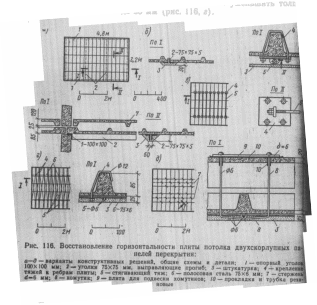 Другое предложение того же автора (рис. 116, д) состоит в подтягивании потолочной панели к панели пола с помощью хомутиков, надеваемых на пересечения ребер верхней панели. Уменьшение высоты равно 25 мм, потолок гладкий. Применение этого способа возможно, правда, только при целесообразности полном замены полов.