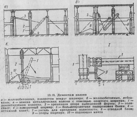 Демонтажу колонны предшествуют: демонтаж подкрановых балок, вывешивание конструкций покрытия, установка и закрепление двух лебедок, установка отводных блоков, запасовка канатов полиспастов, мероприятия по охране труда. После выполнения этих работ колонну стропят выше ее центра тяжести канатами, идущими от двух лебедок (одна – тянущая, другая – удерживающая) и лебедками выбирают слабину канатов. На колонне жестко закрепляют поворотный шарнир и вырубают бетон участка колонны между верхней и нижней обоймами шарнира. После перерезания арматуры колонну опускают поворотом вокруг шарнира включением тянущей и тормозной лебедок. Демонтированную колонну освобождают от оснастки, грузят на транспорт (автомобильный или железнодорожный) и вывозят.